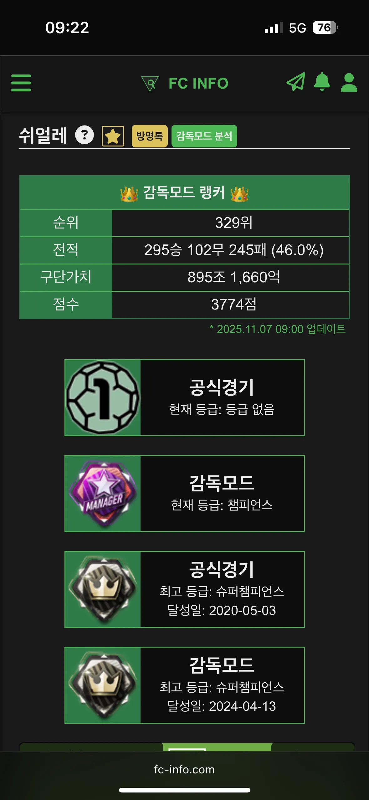 순위, 전적, 구단가치, 점수가 기록된 박스가 뜨지요